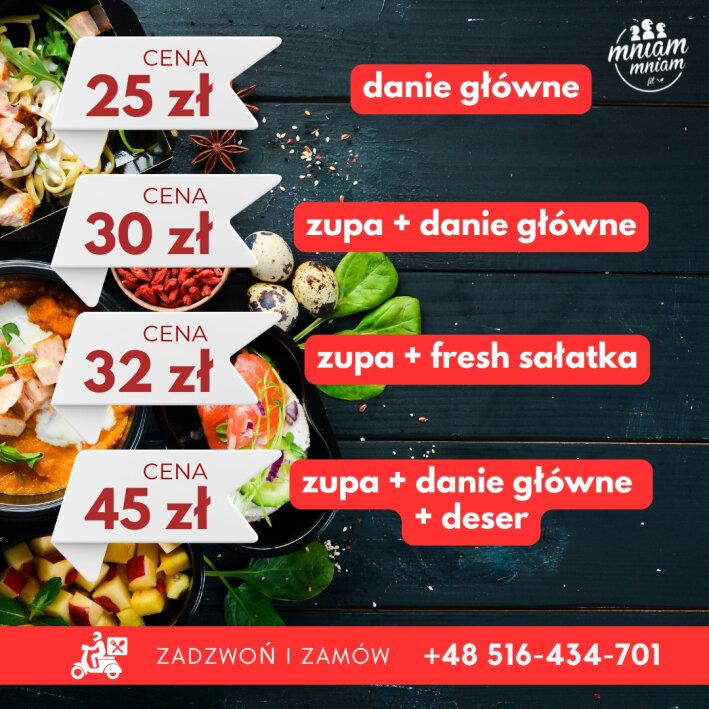 - Domowy smak – nasze obiady przygotowujemy z najwyższej jakości, świeżych składników, byś mógł cieszyć się smakiem jak u mamy.